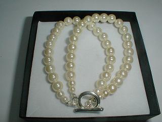 31.Delightful Two Row Pearl Bracelet with a Silver Tones Toggle Clasp. Complete in a Black Carded Presentation Box.
