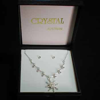 Austrian Crystal Necklace and Earring Set, with Sun Flower design. Necklace has snake chain. Boxed as shown.