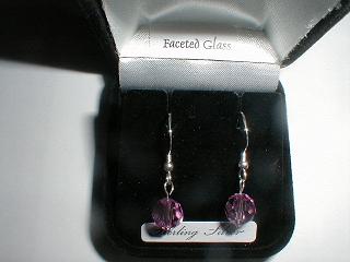 Delightful Amethyst AB Crystal 8mm Sparkling Faceted Glass Earrings Hanging from Sterling Silver Earwires. Complete in a Black Imitation Velvet Presentation Box.