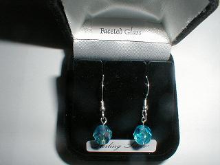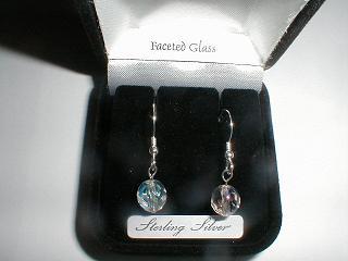 Delightful Aqua AB Crystal 8mm Sparkling Faceted Glass Earrings Hanging from Sterling Silver Earwires. Complete in a Black Imitation Velvet Presentation Box.