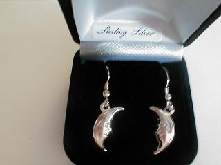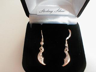 Delightful Shiny Half Moon Charms Sterling Silver Earrings. Please see matching pendants on home page index. Complete in a Black Imitation Velvet Presentation Box.