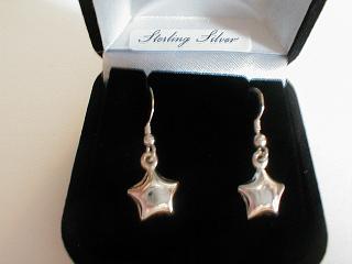 Delightful Shiny Puffed Stars Charms Sterling Silver Earrings. Please see matching pendants on home page index. Complete in a Black Imitation Velvet Presentation Box.